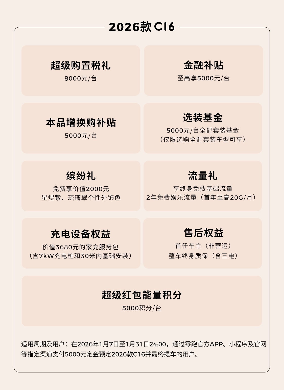 即日起到 2026 年 1 月 31 日 24:00 期间,支付 5000 元定金定购零跑 C16 并最终提车的用户可享 5000 元 / 辆本品增换购补贴、8000 元 / 辆超级购置税补贴、5000 元 / 辆全配套装基金(仅限选购全配套装车型可享)、至高 5000 元 / 辆金融补贴、价值 3680 元家充服务包限时免费(含 7 千瓦充电桩和 30 米内基础安装)、价值 2000 元个性外饰色限时免费、超级红包能量积分 5000 积分 / 辆、2 年免费娱乐流量(首年至高 20G / 月,基础流量终身免费)、首任非营运车主终身免费整车质保(含三电)。