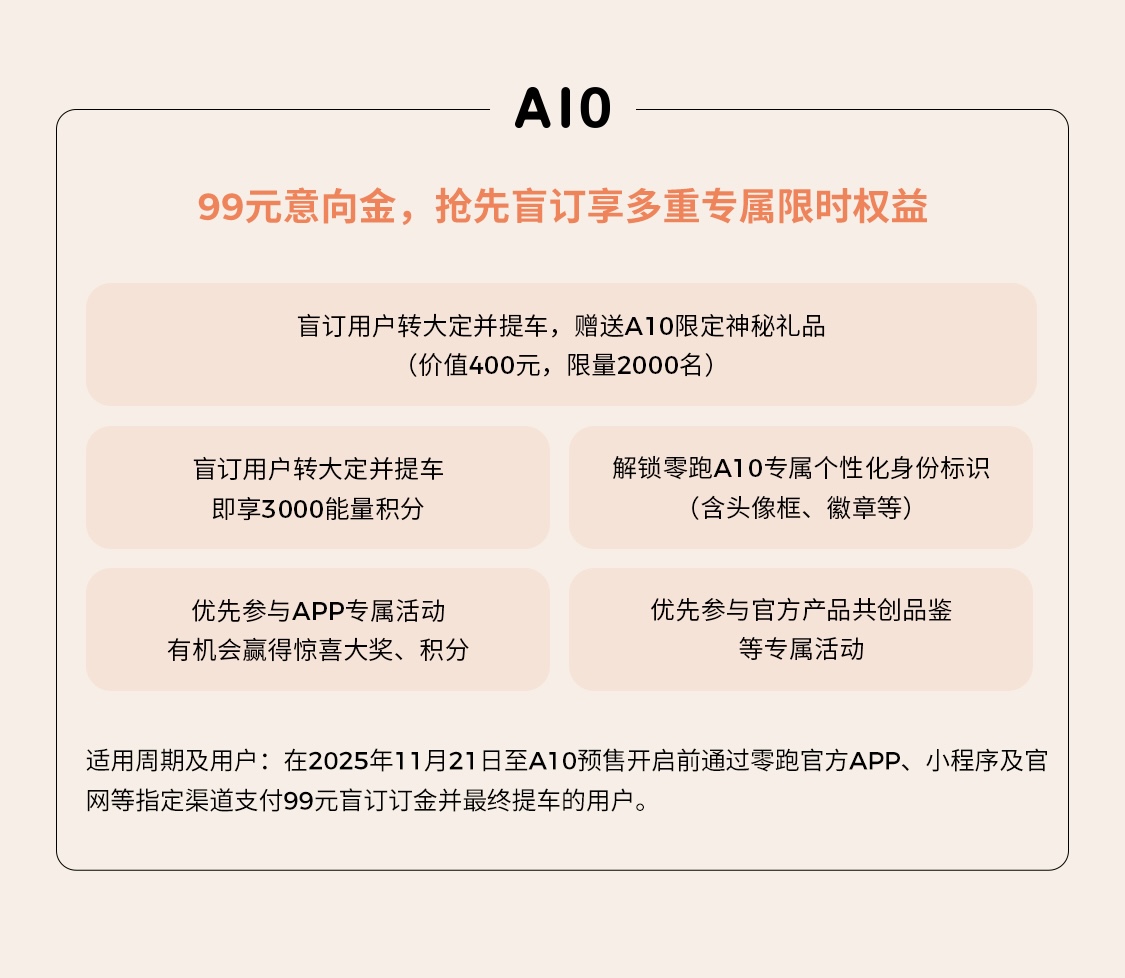 即日起到 2026 年 1 月 31 日 24:00 期间,支付 5000 元定金定购零跑 B10 并最终提车的用户可享 5000 元 / 辆超级购置税补贴、4000 元 / 辆本品增换购补贴、至高 5000 元 / 辆金融补贴、价值 2000 元摩根粉 / 星夜蓝 / 曦露紫个性外饰色限时免费、超级红包能量积分 5000 积分 / 辆、价值 3680 元家充服务包限时免费(含 7 千瓦充电桩和 30 米内基础安装)、2 年免费娱乐流量(4G / 月,基础流量终身免费)、首任非营运车主终身免费整车质保(含三电)。
