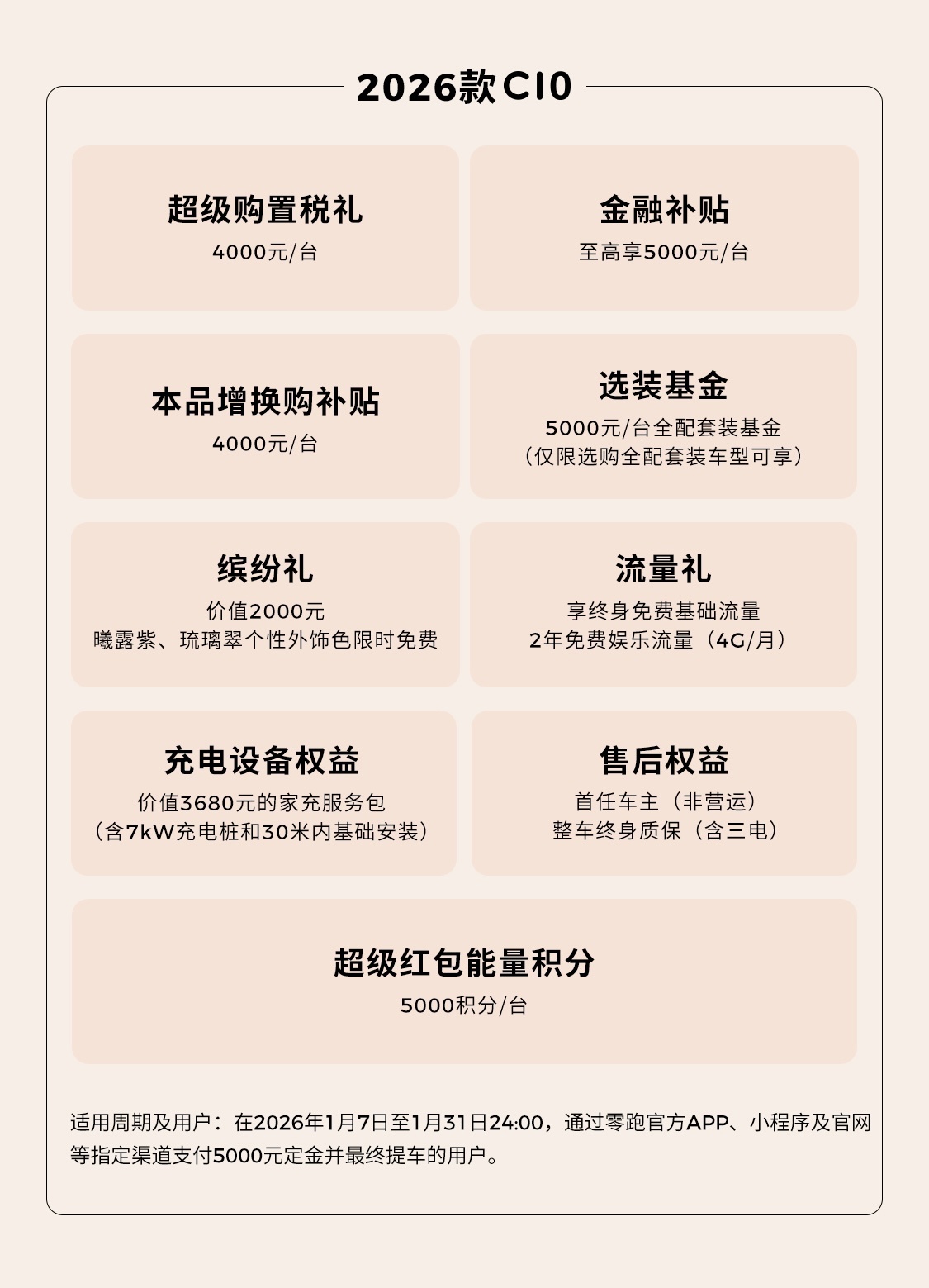 即日起到 2026 年 1 月 31 日 24:00 期间,支付 5000 元定金定购零跑 C10 并最终提车的用户可享 4000 元 / 辆超级购置税补贴、4000 元 / 辆本品增换购补贴、5000 元 / 辆全配套装基金(仅限选购全配套装车型可享)、至高 5000 元 / 辆金融补贴、价值 3680 元家充服务包限时免费(含 7 千瓦充电桩和 30 米内基础安装)、价值 2000 元曦露紫 / 琉璃翠个性外饰色限时免费、超级红包能量积分 5000 积分 / 辆、2 年免费娱乐流量(4G / 月,基础流量终身免费)、首任非营运车主终身免费整车质保(含三电)。