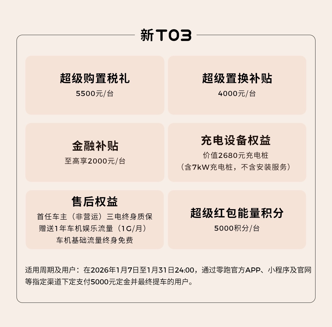 即日起到 2026 年 1 月 31 日 24:00 期间,支付 5000 元定金定购零跑 T03 并最终提车的用户可享 4000 元 / 辆超级置换补贴、5500 元 / 辆超级购置税补贴、至高 2000 元 / 辆金融贴息、价值 2680 元家充服务包限时免费(含 7 千瓦充电桩,不含安装服务)、超级红包能量积分 5000 积分 / 辆、首任非营运车主三电终身质保、1 年车机娱乐流量免费(1G / 月)、车机基础流量终身免费。