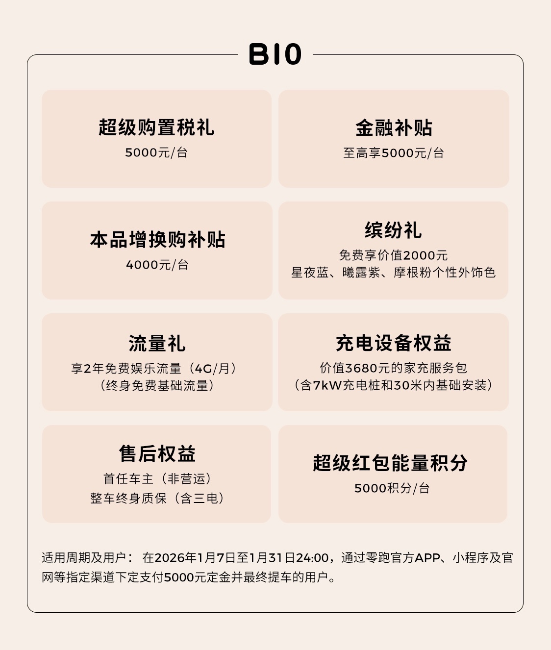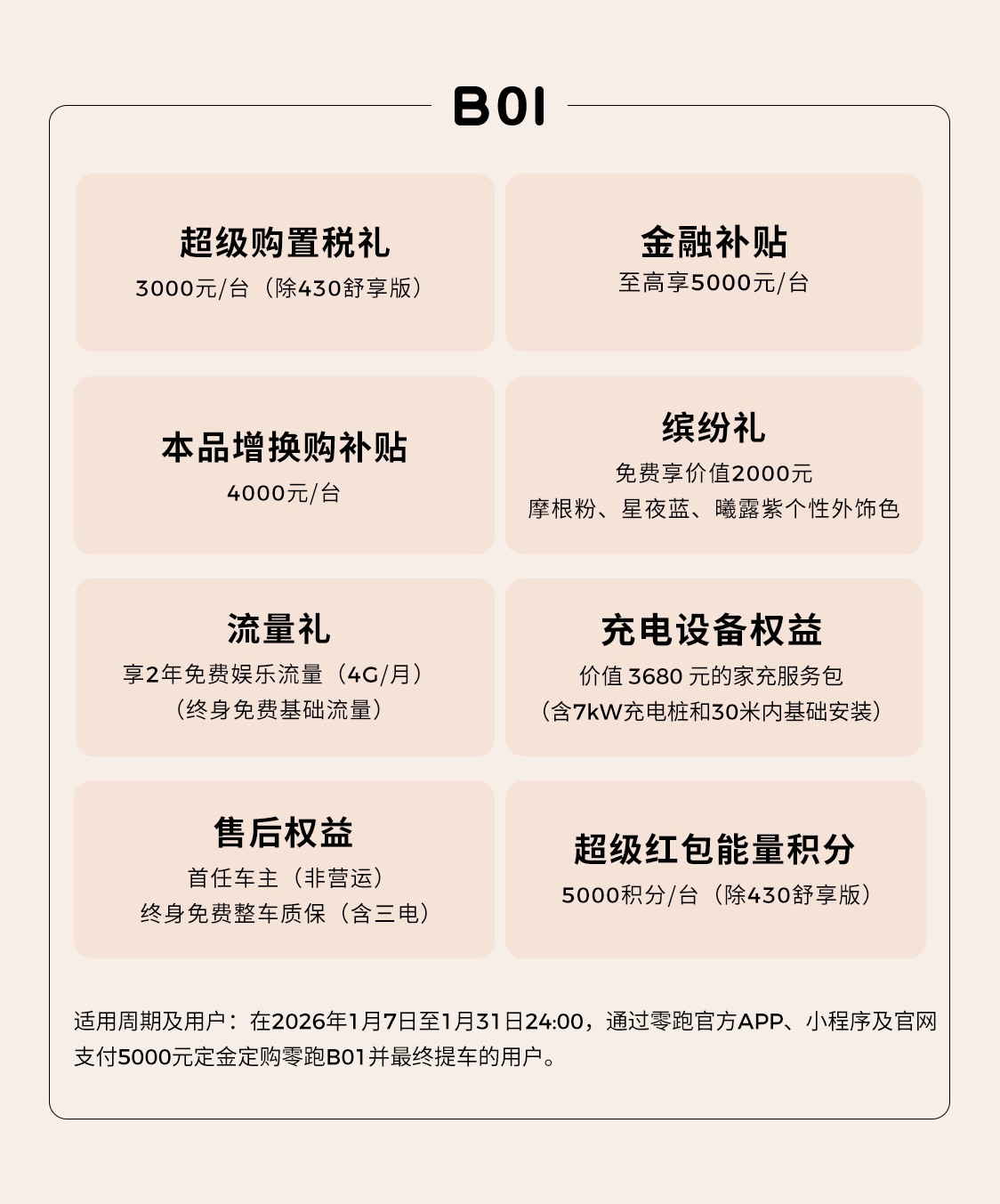 即日起到 2026 年 1 月 31 日 24:00 期间,支付 5000 元定金定购零跑 B01 并最终提车的用户可享 4000 元 / 辆本品增换购补贴、超级购置税补贴 3000 元 / 辆(除 430 舒享版)、至高 5000 元 / 辆金融贴息、价值 2000 元个性外饰色限时免费、超级红包能量积分 5000 积分 / 辆、价值 3680 元家充服务包(含 7 千瓦充电桩和 30 米内基础安装)、2 年免费娱乐流量(4G / 月,基础流量终身免费)、首任非营运车主终身免费整车质保(含三电)。