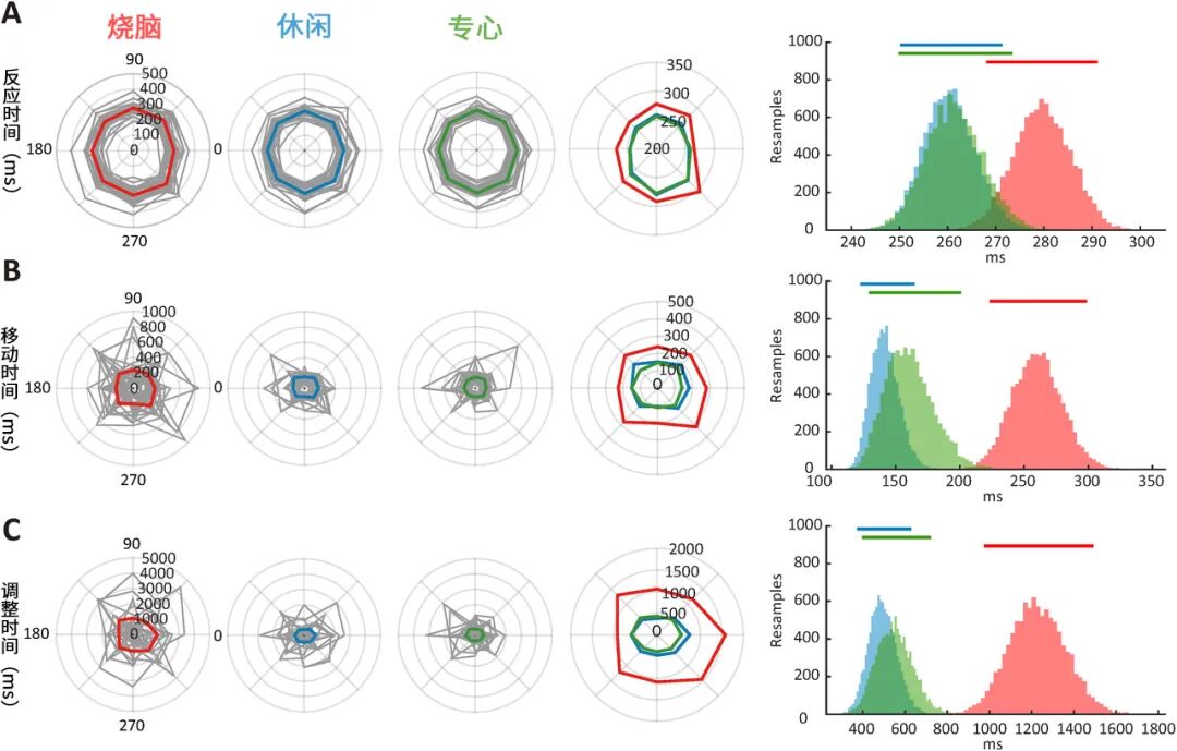 通过高精度的眼动仪测量,研究者把“看见”这个瞬间细分成了三步,发现烧脑拖慢了每一步,而休闲组与专心组之间没有明显差别。