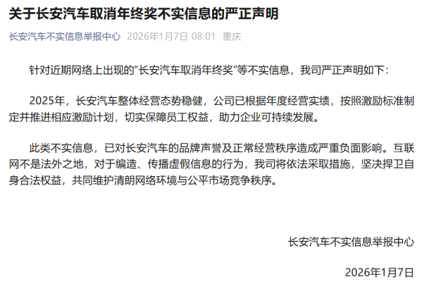 近日,“长安汽车2025年销量目标完成97%仍取消年终奖”的传言在社交平台引发热议。针对这一传言,长安汽车不实信息举报中心迅速发布声明辟谣。