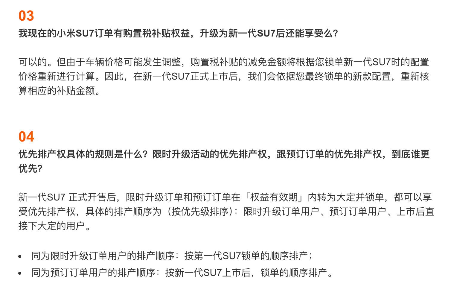 同时,现款的小米SU7订单有购置税补贴权益,升级为新一代SU7后还能继续享受。但由于车辆价格可能发生调整,购置税补贴的减免金额将根据用户锁单新一代SU7时的配置价格重新进行计算。