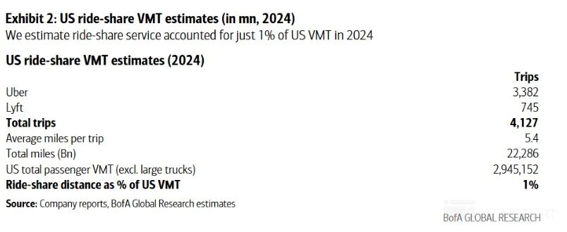 美国网约车市场 2024 年总订单量约 41.3 亿次,按每单载客里程平均 5.4 英里计算,总载客里程约为 227 亿英里,仅占客运类车辆总里程的不到 1%(约 0.8%)。