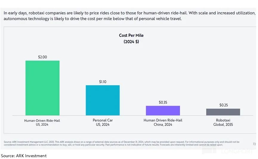 从整体看,ARK Invest 假设其单英里成本最终将降至 0.25 美元,远低于美国私家车约 0.7-1 美元/英里的综合使用成本,更大幅低于目前网约车(Uber/Lyft)约 1.7-2 美元/英里的实际运营成本(其中司机人力成本占比最高)。