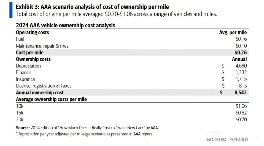 而在美国市场,根据 AAA 的测算,当私家车年均行驶里程在 1 万-2 万英里时,每年的使用成本约在 0.7-1.1 美元/英里之间,但美国网约车的打车费用约在 2.5 美元/英里,大幅高于私家车的年均使用成本。