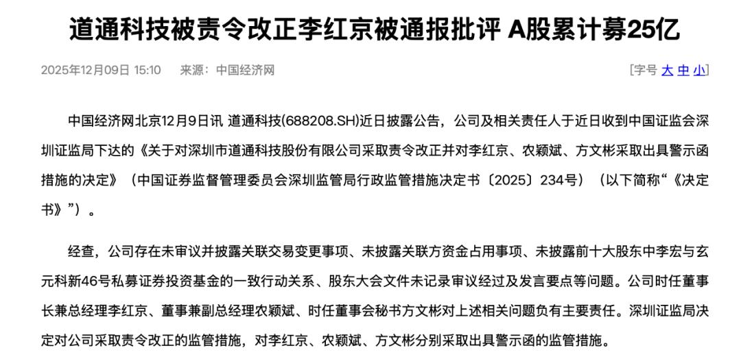 2025年12月,道通科技存在未审议并披露关联交易变更事项、未披露关联方资金占用事项、未披露前十大股东中李宏与玄元科新46号私募证券投资基金的一致行动关系、股东大会文件未记录审议经过及发言要点等问题,被深圳证监局采取责令改正的行政监管措施,实际控制人李红京及相关责任人被出具警示函。