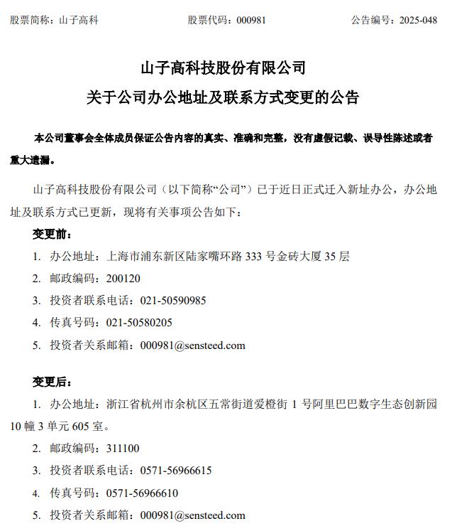 签约仪式结束的第二天,山子高科公告变更了办公地址,从上海迁移至浙江省杭州市余杭区的阿里巴巴数字生态创新园。