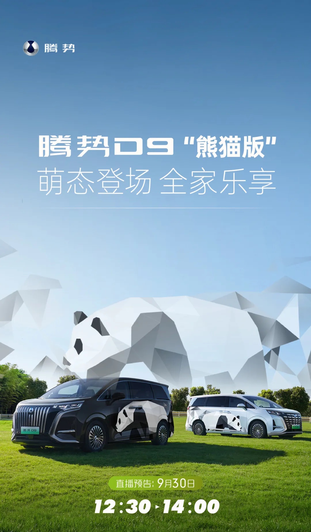 IT之家 9 月 29 日消息,比亚迪旗下腾势汽车今天宣布,腾势 D9“熊猫版”将于明天(30 日)12:30-14:00 正式登场。官方放出的预告图显示,新车在原有车型的黑、白两款配色基础上,增加了大面积的熊猫涂装。