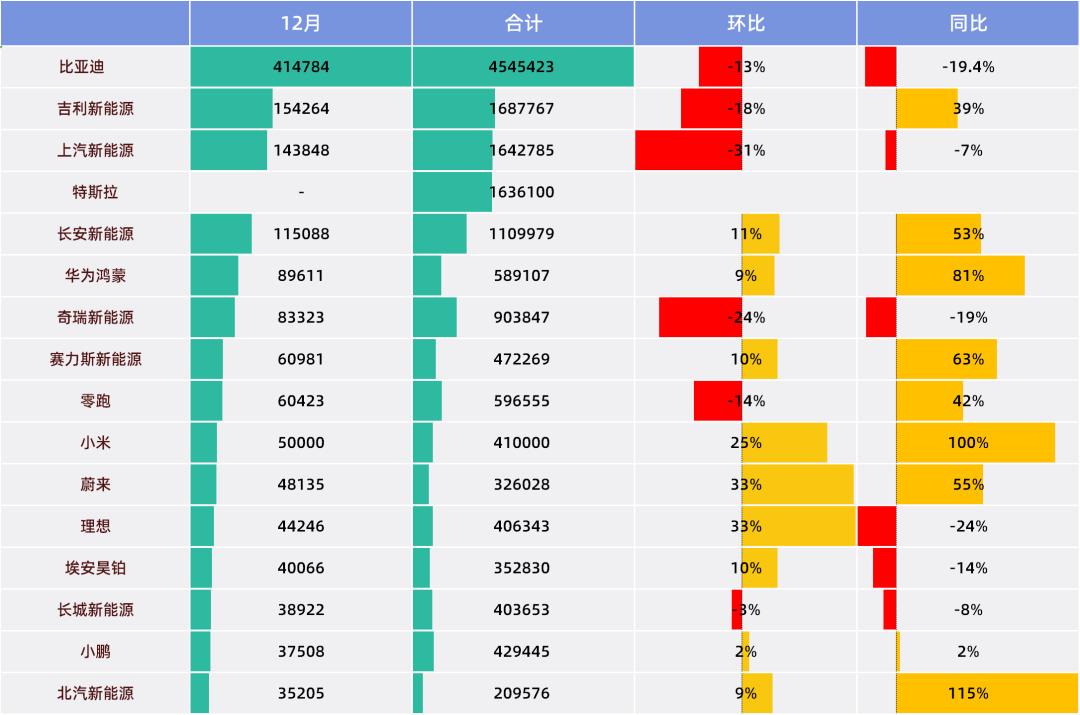 此起彼伏,第三梯队企业在12月表现亮眼。华为鸿蒙、小米、蔚来、北汽创造新高,由于这些企业的强势,15家企业中位数达到60423台,比上月增加5220台。