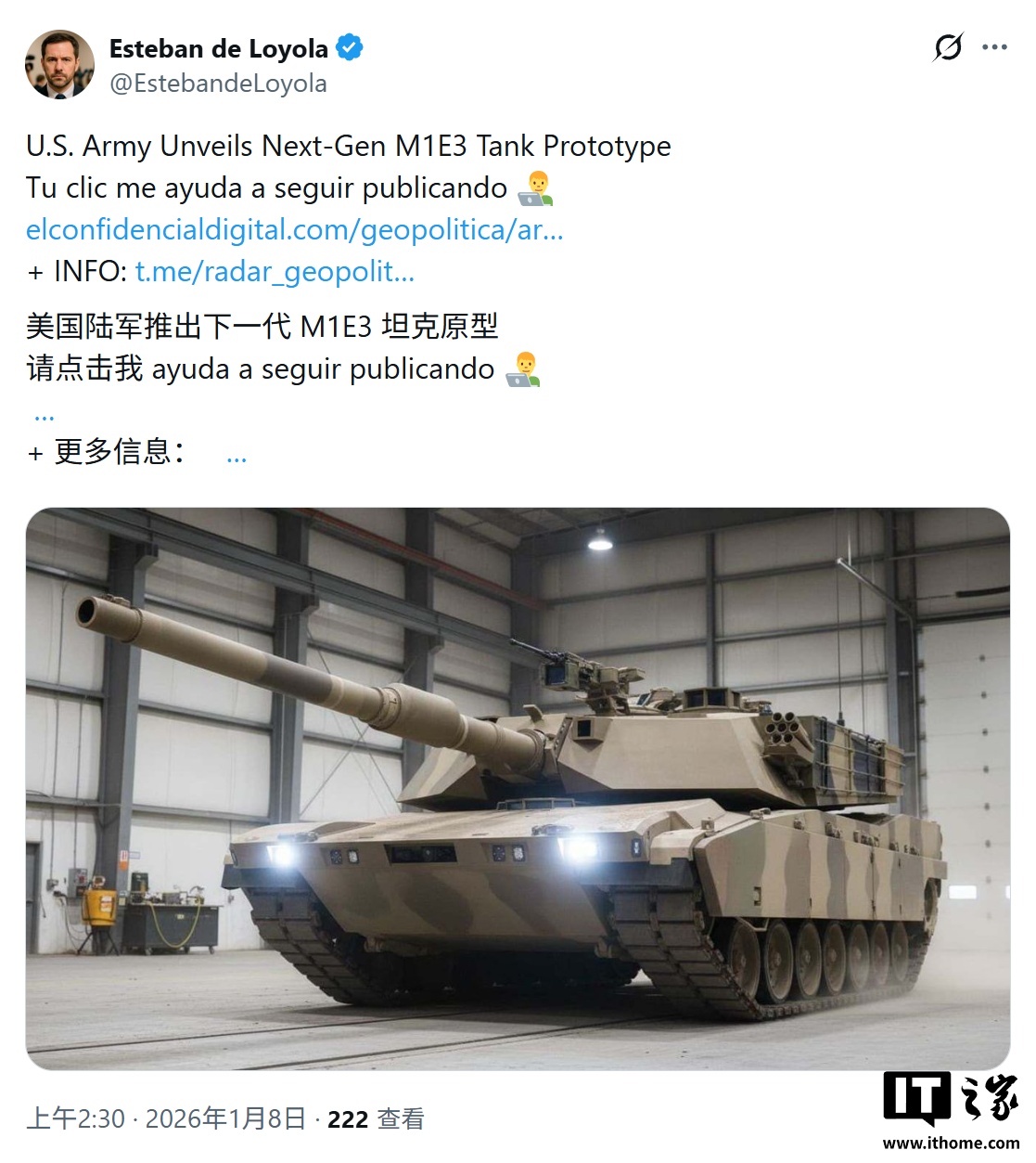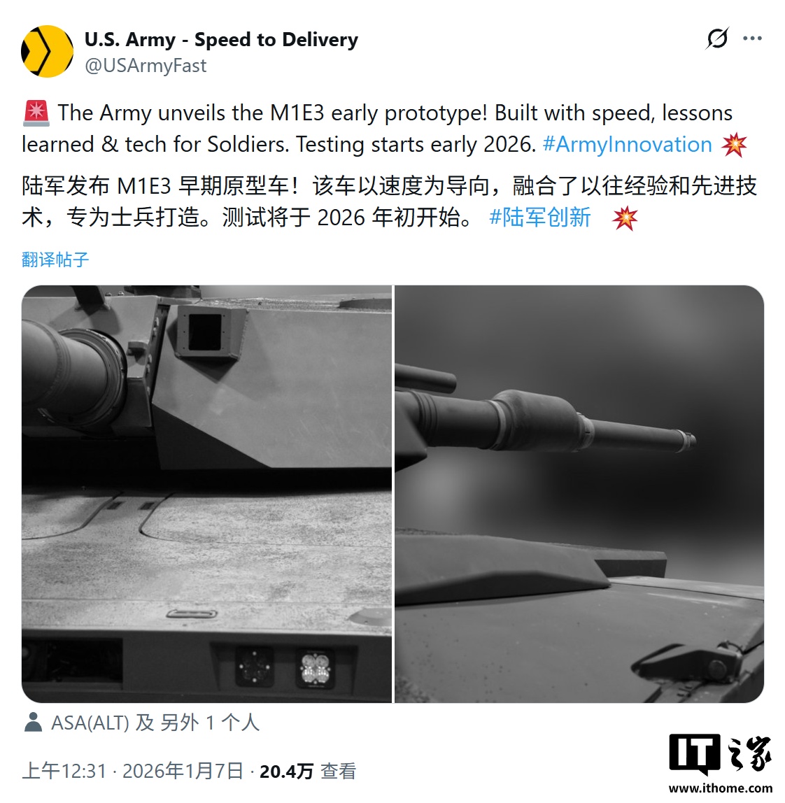 IT之家 1 月 10 日消息,The War Zone 于 1 月 6 日发布博文,报道称美国陆军已接收首辆 M1E3 艾布拉姆斯(Abrams)主战坦克原型车,并公布了首批原型车图像,确认该车由 Roush 公司制造,并将于 2026 年初启动测试。
