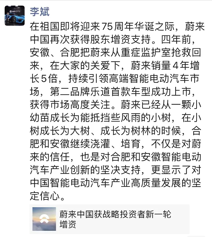在祖国即将迎来 75 周年华诞之际,蔚来中国再次获得股东增资支持。四年前,安徽、合肥把蔚来从重症监护室抢救回来,在大家的关爱下,蔚来销量 4 年增长 5 倍,持续引领高端智能电动汽车市场,第二品牌乐道首款车型成功上市,获得市场高度关注。蔚来已经从一颗小幼苗成长为能抵挡些风雨的小树,在小树成长为大树、成长为树林的时候,合肥和安徽继续浇灌、培育,不仅是对蔚来的信任,也是对合肥和安徽智能电动汽车产业创新的坚决支持,更显示了对中国智能电动汽车产业高质量发展的坚定信心。