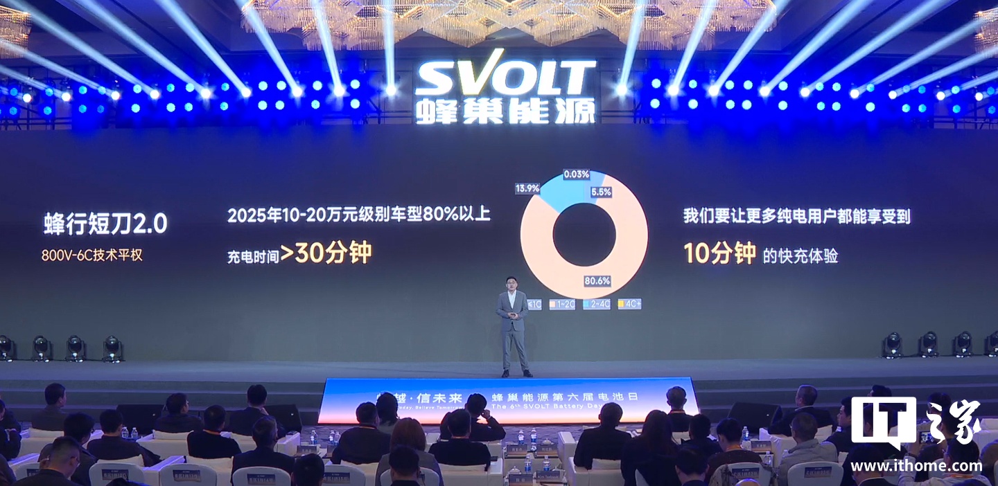 第一代“蜂行短刀 2.0”支持 6C 快充,10 分钟充电到 80%;第二代“蜂行短刀 2.0”支持 12C 快充(还在研发中),8 分钟充电到 80%。