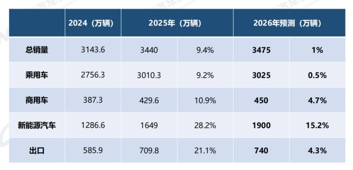 基于对宏观政策、行业治理及国际市场的综合研判,中汽协对2026年车市做出预测:全年汽车总销量预计为3475万辆,同比增长约1%。其中,新能源汽车销量有望达到1900万辆,渗透率将持续提升;汽车出口预计为740万辆,继续保持全球领先地位。