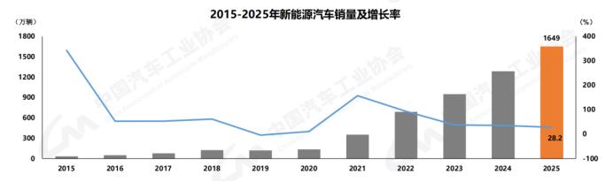 新能源汽车渗透率持续攀升。2025年,新能源汽车产销分别完成1662.6万辆和1649万辆,同比增幅均接近30%,市场渗透率达到47.9%,远超《稳增长方案》中1550万辆的预期目标。