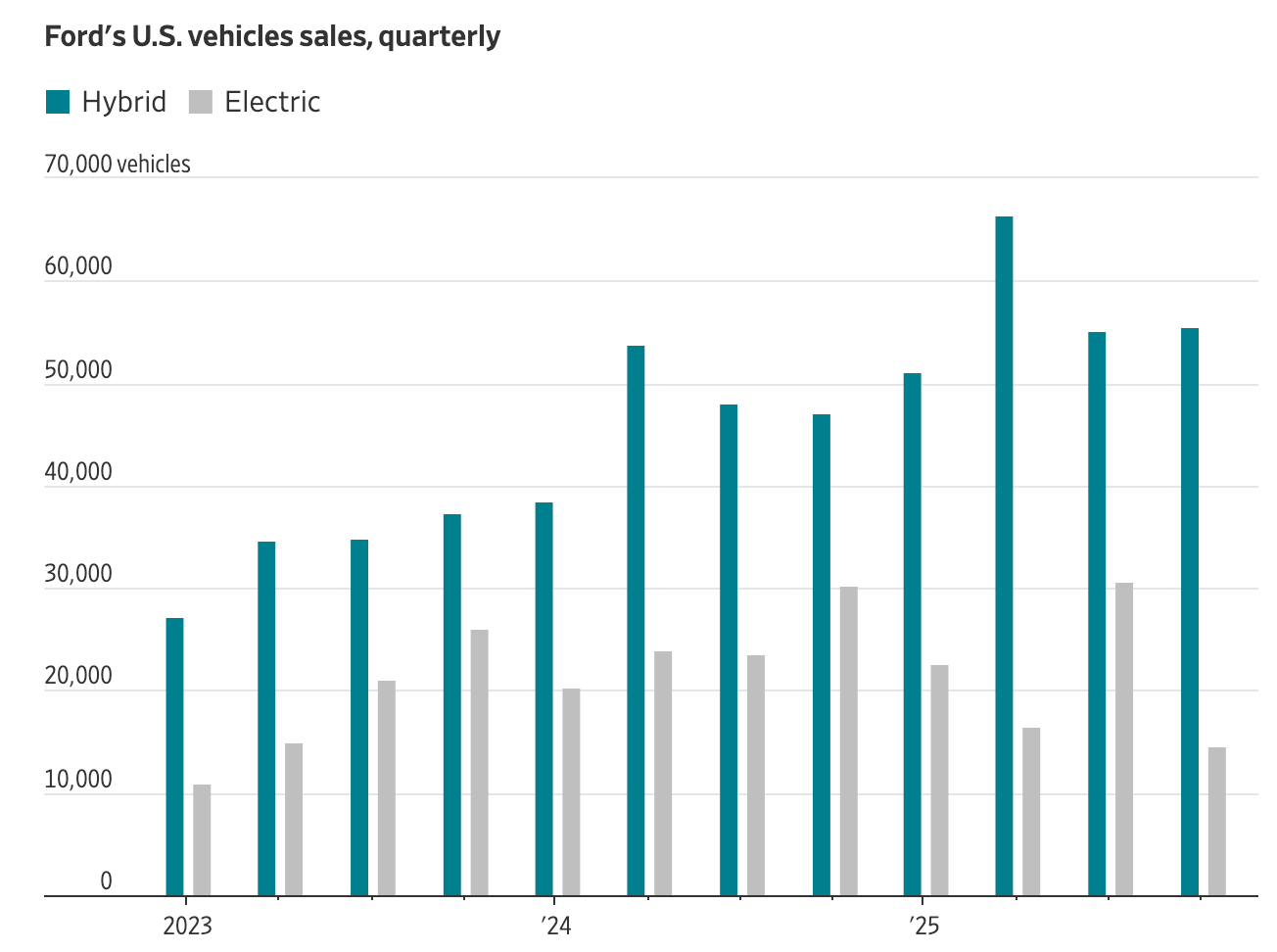 福特上月表示,由于电动车需求下滑,公司将调整战略减少电动车生产,并计提大约195亿美元的费用,主要与其电动车业务相关。福特表示,到2030年,公司全球汽车销量中大约一半将由混合动力车、增程型插电式混合动力车和纯电动车组成。