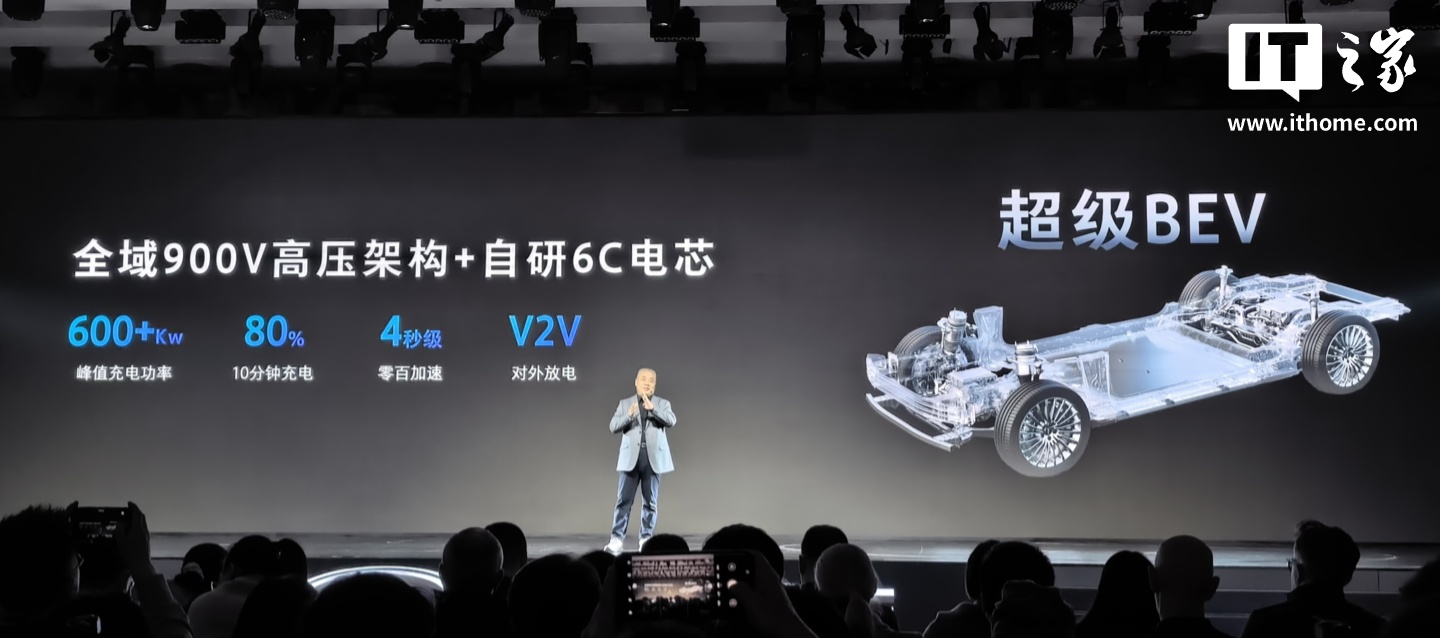 超级 BEV 则采用全域 900V 高压架构 + 自研 6C 电芯,峰值充电功率超 600kW,10 分钟充电 80%,零百加速 4 秒级,支持 V2V 对外放电。