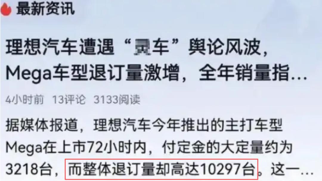 图/理想Mega上市72小时被退订10297辆 来源/互联网 新能源观截图