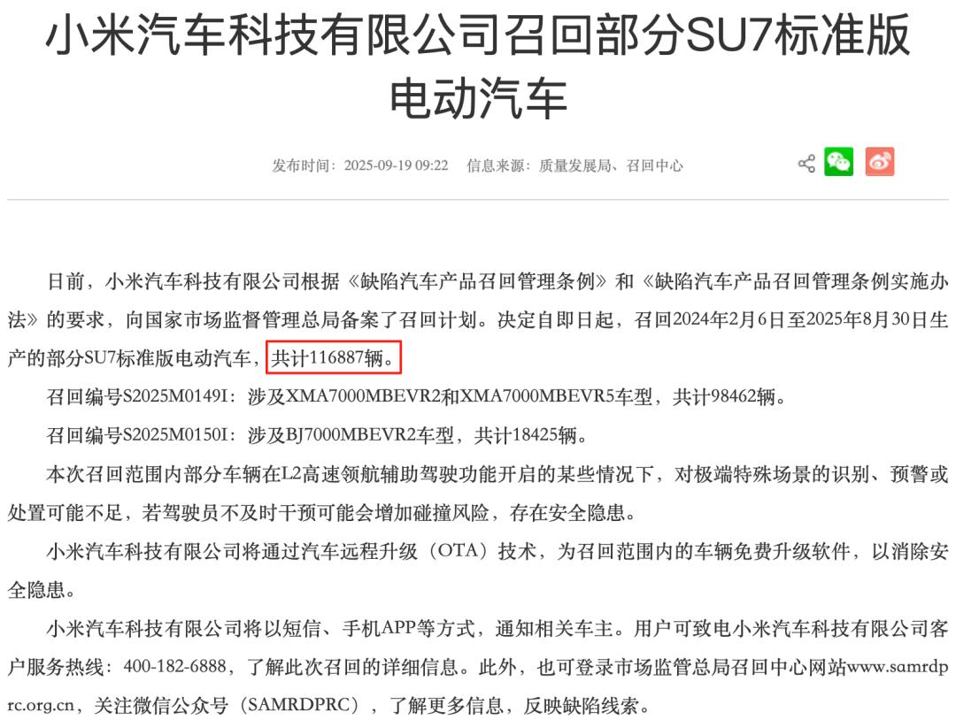 图/2025年小米汽车召回情况 来源/互联网 新能源观截图