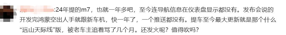 对于更新问题,一位问界M7车主称,提车至今不过一年多,仪表盘始终无法显示导航信息,这段时间里从未收到过任何一次系统更新推送。