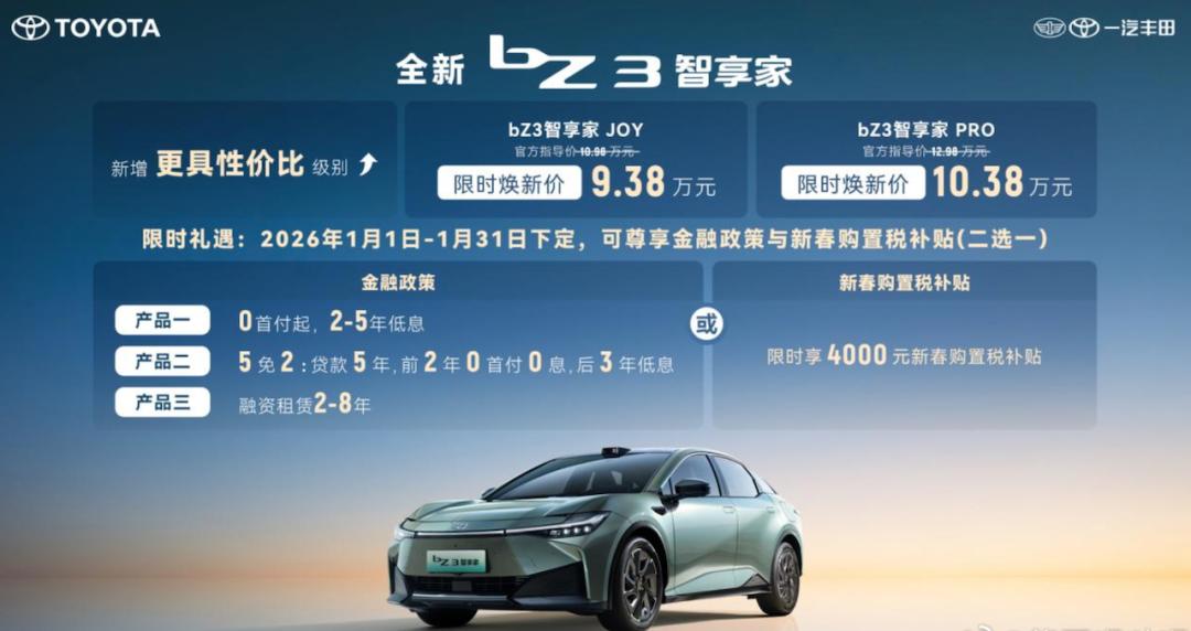 一汽丰田率先亮剑,旗下纯电轿车bZ3推出了极其震撼的限时价——9.38万元。相较于此前的市场定位,这一价格相当于直接下调了7.6万元,下探幅度接近45%。