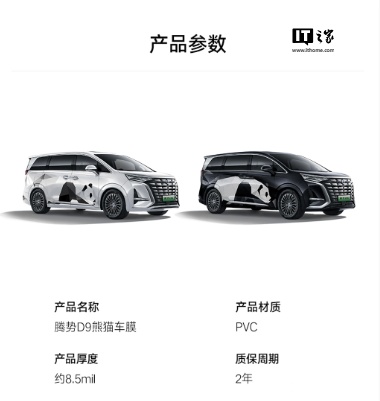 IT之家 9 月 30 日消息,今日腾势 D9 熊猫版正式亮相,该车型基于腾势 D9 打造,主要特色在于采用了腾势与用户共创的熊猫车膜。官方表示,腾势 D9 熊猫版属于后期改装产品,由腾势门店负责安装并交付给用户,实际外观效果以交付为准。