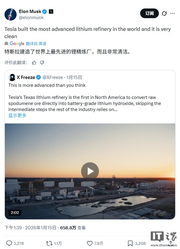 IT之家注意到,埃隆・马斯克在社交平台 X 上发文强调了该项目的重要意义,称“美国最大的锂精炼厂现已投入运营”。他还在另一条评论中表示,这座工厂是“全球技术最先进的锂精炼厂”,并着重强调其“清洁环保的特性”。