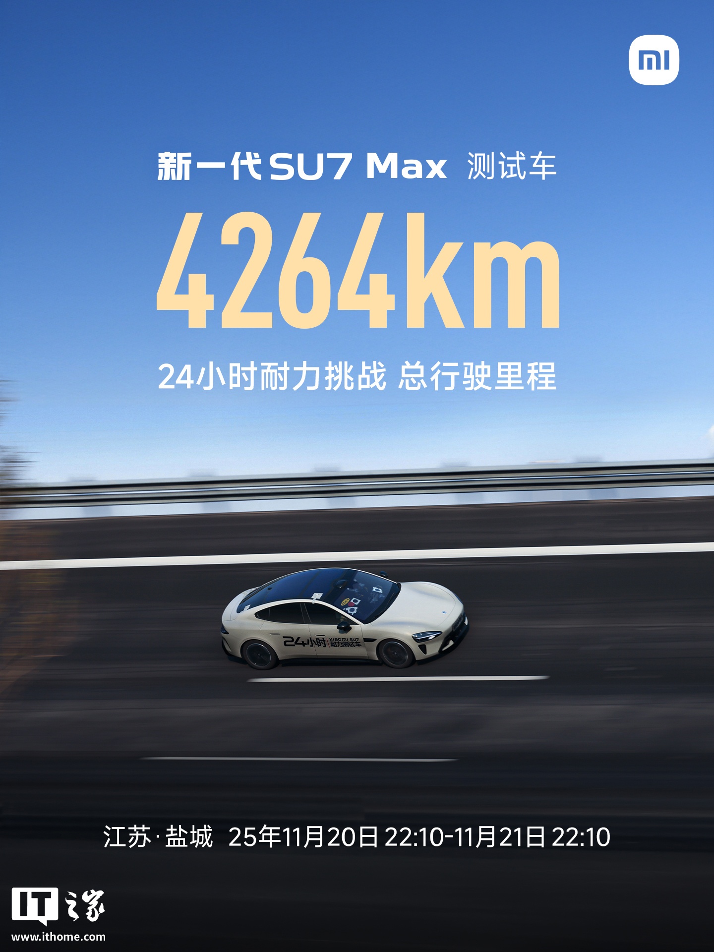 IT之家 1 月 19 日消息,今天上午,小米汽车官微宣布:新一代 SU7 Max 取得 4264km 总行驶里程的 24 小时耐力挑战成绩,号称“用短跑速度跑马拉松”。