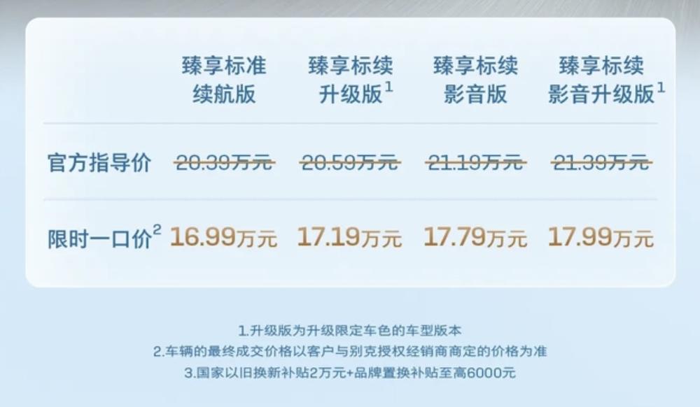 据媒体报道,四款臻享车型直降3.4万元,限时价格为16.99-17.99万元,同时该车还可以享受至高2.6万元置换补贴(国家以旧换新补贴20000元+品牌置换补贴至高6000元)。