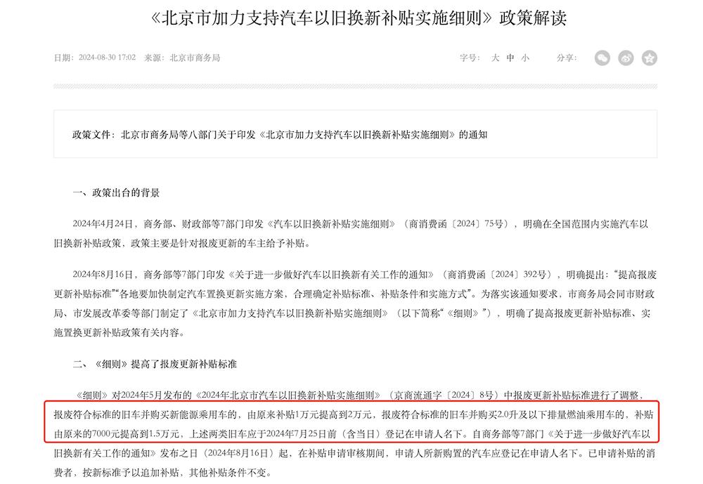 ▲《北京市加力支持汽车以旧换新补贴实施细则》政策