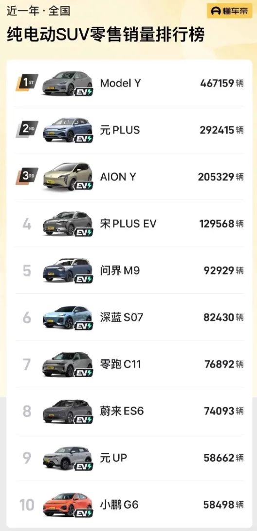 根据懂车帝近一年纯电SUV国内零售销量榜单,Model Y以“断层式”领先优势位居第一,销量为46.71万辆,比排名第二的比亚迪元 PLUS销量多出了17.5万辆。