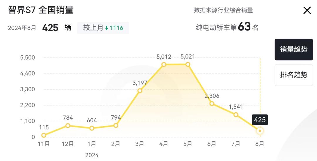 懂车帝显示,今年8月智界S7的销量只有425辆,在纯电轿车中排名第63名。今年以来,只有3、4、5三个月销量突破3000,最高月销5021辆。
