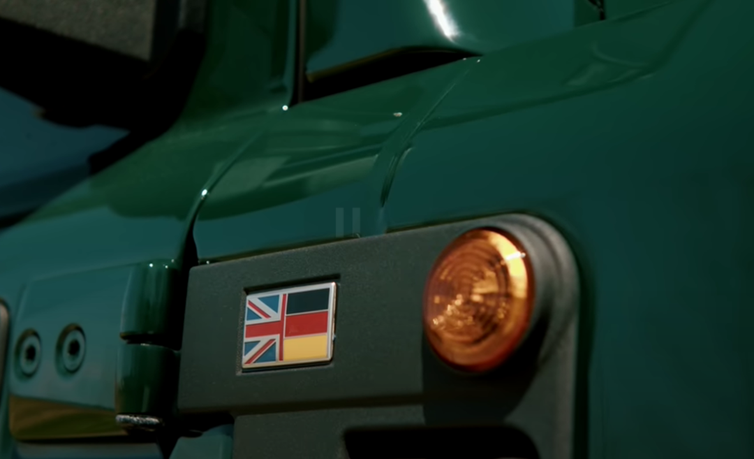 车头也是方盒子的经典圆灯,名字 Grenadier 放到了机盖的左侧,雨刮的底部有着版本名,车身左侧则是英国跟德国的旗帜,彰显它在英国外观下有着德国的工艺。