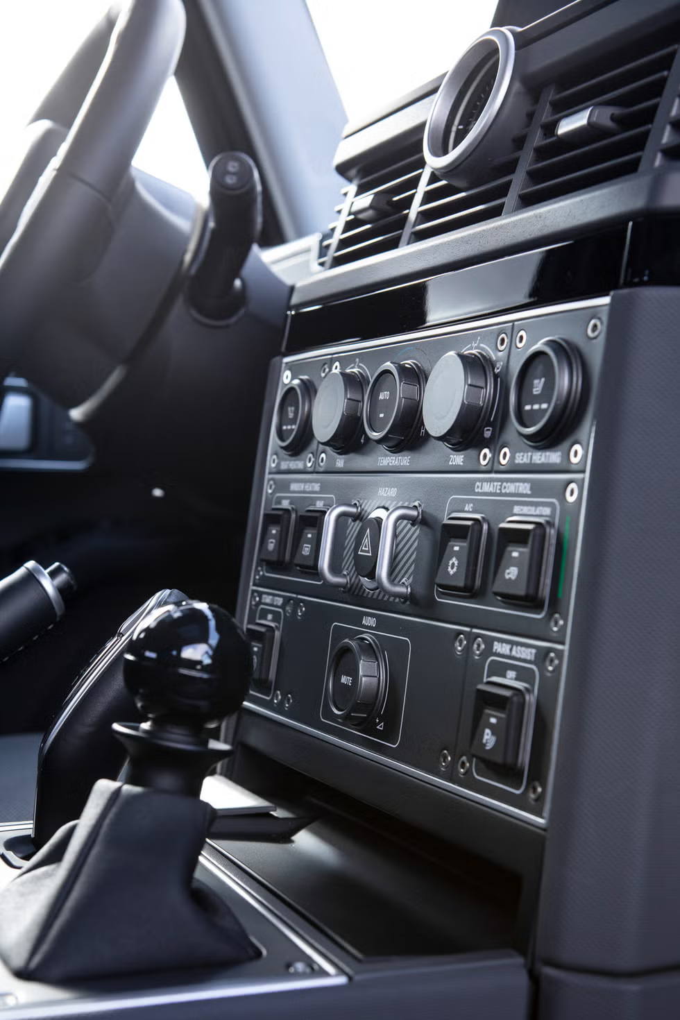 这车的外观简直就是对着老卫士复刻,硬朗平直的线条,三个方形侧窗。。。不过,在车身尺寸上,掷弹兵的三围是 4896x1930x2036mm,比卫士大了一圈(4641×1791×2029mm),反而跟奔驰大 G 差不多(4877x1931x1975mm)。
