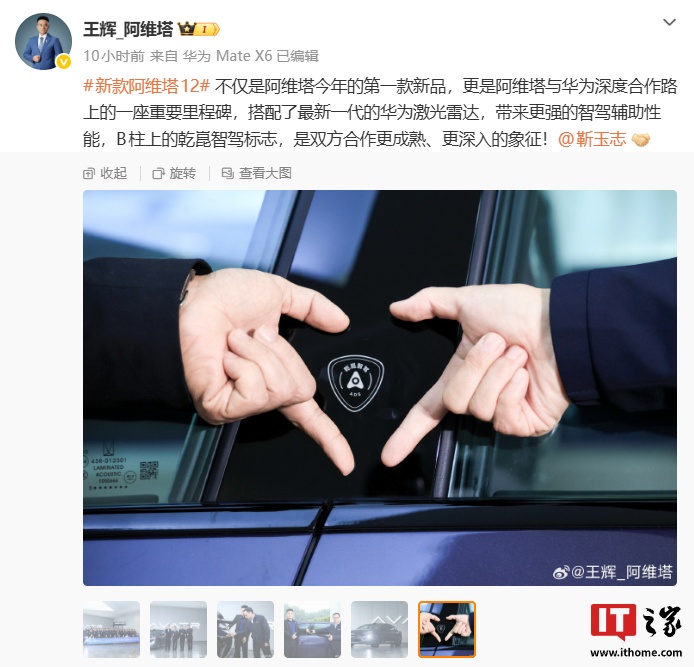 阿维塔科技董事长王辉还介绍称,B 柱上的乾崑智驾标志,是双方合作更成熟、更深入的象征。IT之家注意到,王辉的微博配图显示,新款阿维塔 12 也是首款华为乾崑阿维塔战略合作 2.0 车型。