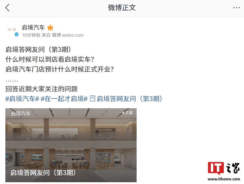 IT之家 1 月 21 日消息,华为乾崑|启境汽车今日发布了答网友问(第 3 期),针对什么时候可以到店看启境实车、门店预计什么时候正式开业等问题进行了解答。