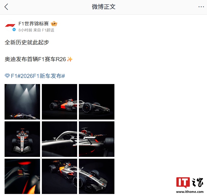 IT之家 1 月 21 日消息,据 F1 世界锦标赛官方微博分享,奥迪发布了首辆 F1 赛车 R26,号称“全新历史就此起步”。