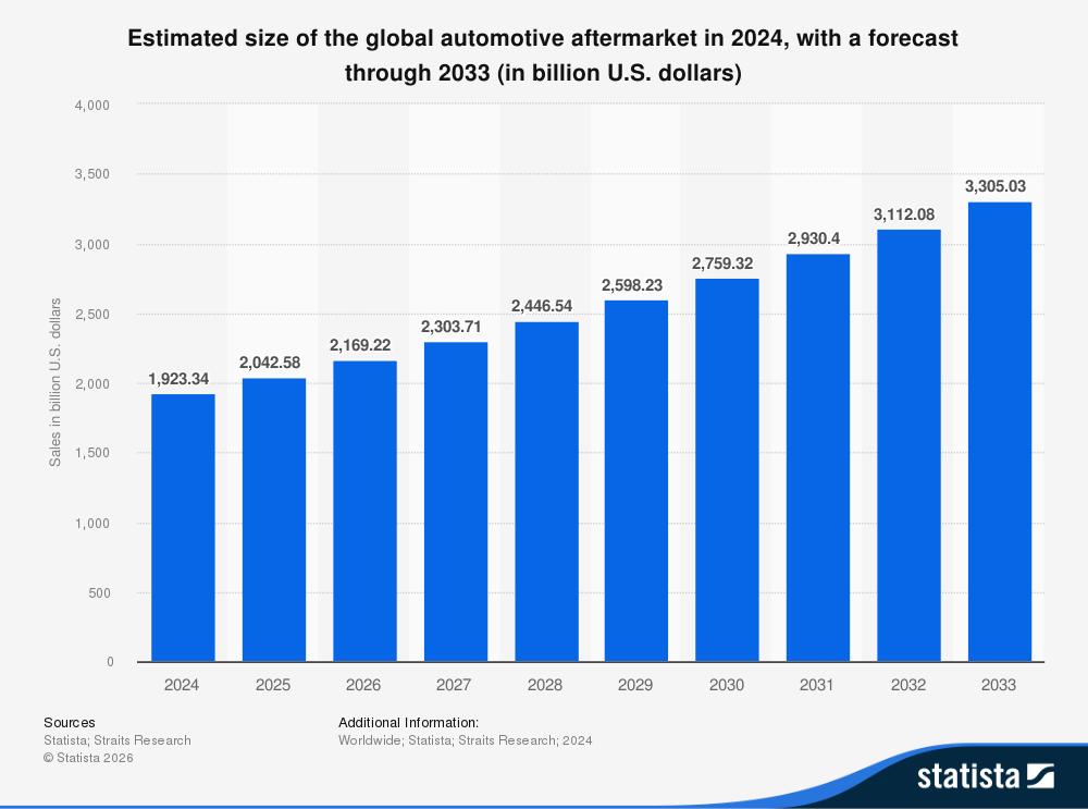 据Statista数据显示,2024年,全球汽车后市场规模超过1.9万亿美元。预计未来几年该市场将继续增长,到2033年将达到约3.3万亿美元。