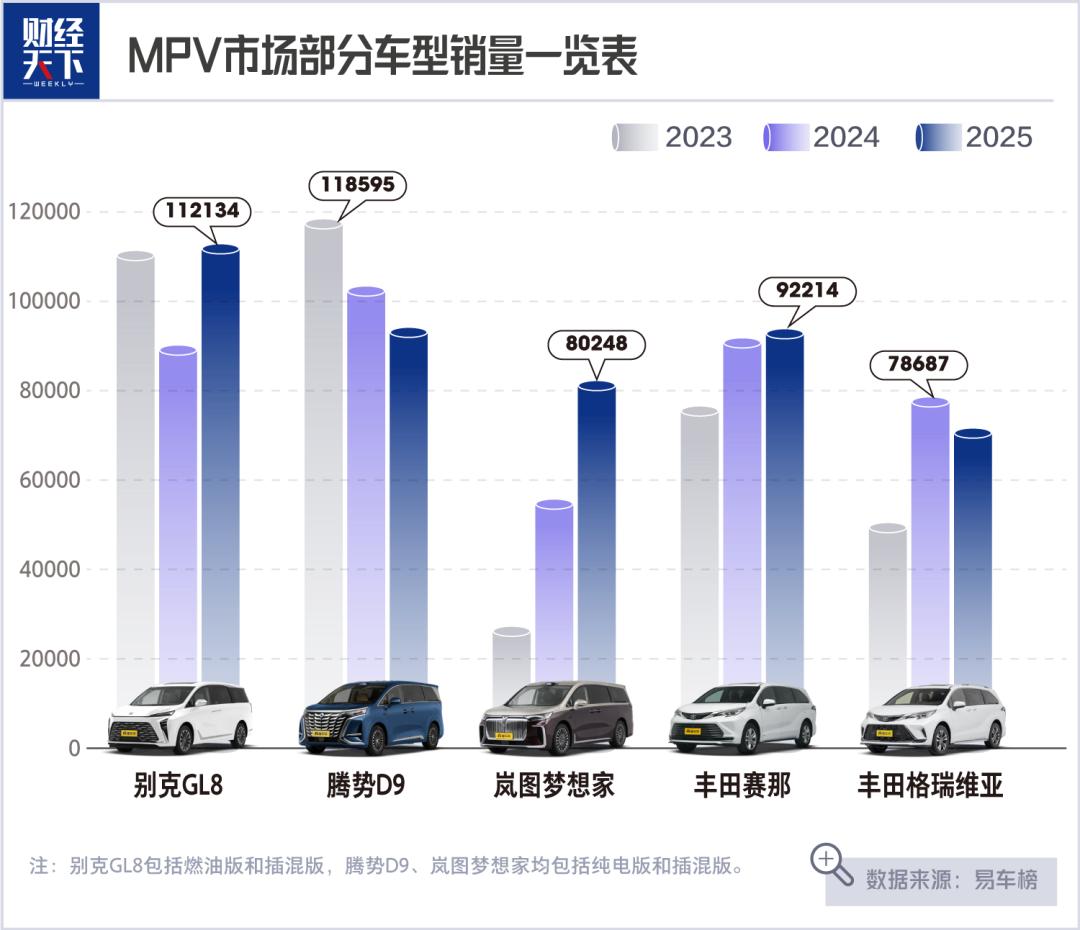 2022年之前,GL8在市场几乎没有对手,并牢牢把握着商务MPV的市场定义权。此后,GL8在腾势D9、岚图梦想家等国产新能源MPV的围剿下销量连续下滑,2023年下跌至11万辆,丢掉了稳坐多年的MPV市场销冠宝座,2024年全年销量进一步下滑至8.77万辆。