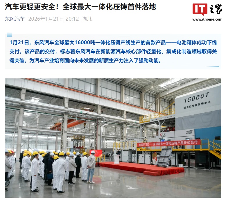 IT之家 1 月 22 日消息,据东风汽车官方昨日分享,1 月 21 日,东风汽车全球最大 16000 吨一体化压铸产线生产的首款产品 —— 电池箱体成功下线交付。