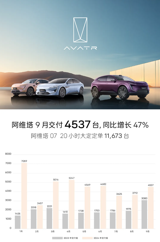阿维塔汽车: 9 月交付新车 4537 辆,同比增长 47%