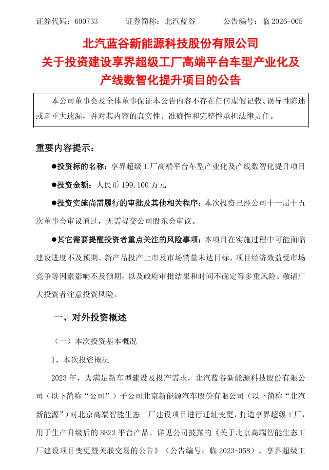 为持续提升品牌价值,增强企业竞争力,满足子公司基于整体发展战略制定的产品规划,北汽新能源拟投资建设享界超级工厂高端平台车型产业化及产线数智化提升项目,对享界超级工厂关键工艺、设备进行升级,同时开展数智化升级改造,以具备 BE22 3.0 高端平台车型生产能力,并全方位提升制造体系的柔性化、效率、质量和智能化水平。本项目预计总投资人民币 199,100 万元。