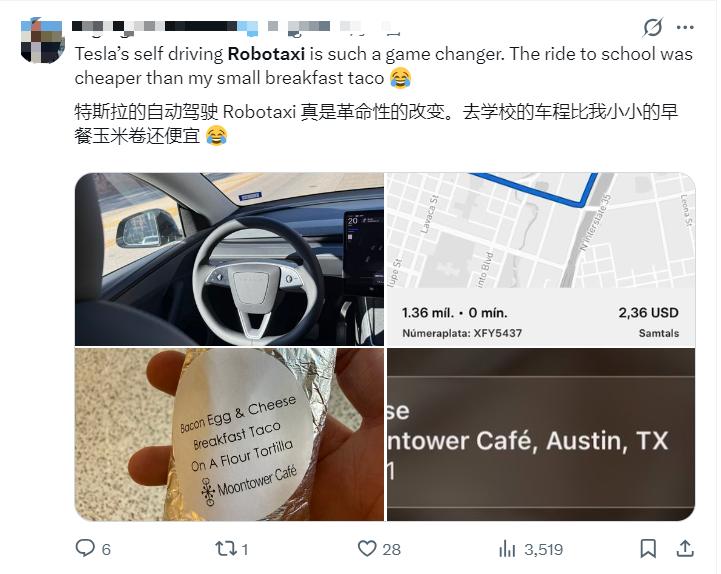 有人打了一辆特斯拉Robotaxi去学校,跑了1.36英里(约2.2公里),车费花了2.71美元(约18.9元),比他手里小小的早餐玉米卷都便宜了。