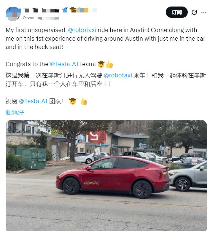 全网第一位体验到车内无人监督、完成特斯拉Robotaxi付费体验的,应该是一位特斯拉的前AI工程师。