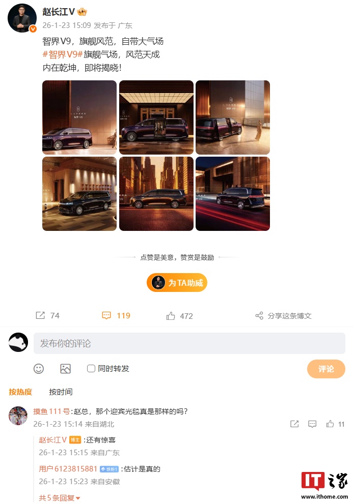 IT之家注意到,有网友在智界汽车执行董事及执行副总裁赵长江的微博下求证智界 V9 侧向迎宾光毯的真实性,赵长江虽未直接回答,但他表示:“还有惊喜。”或暗示该功能确实存在,同时还存在其他惊喜配置。