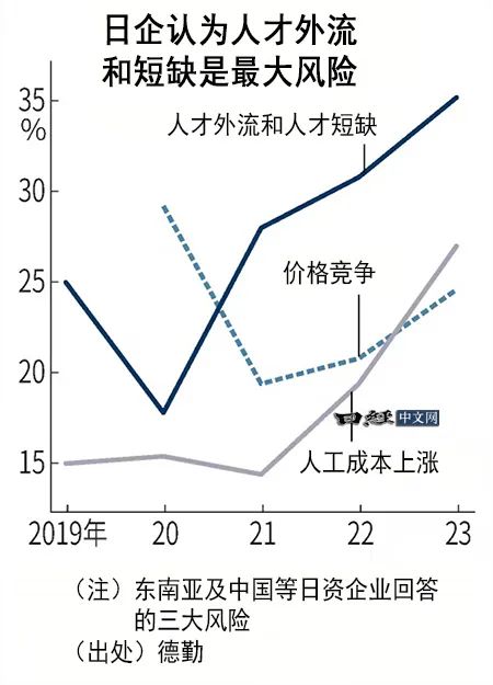 德勤的数据显示,东南亚等地区的日资企业认为的最大风险因素是“人才外流与人才短缺”。2023年,35%的受访企业做出这样的回答,比2019年增加了10个百分点。