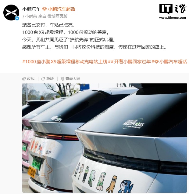 IT之家 1 月 26 日消息,小鹏汽车今日官宣:1000 座小鹏 X9 超级增程移动充电站正式上线。在小鹏汽车总部举行的交付仪式上,10 位车主代表接过 V2V 车对车充电线与“移动充电站”专属车贴。