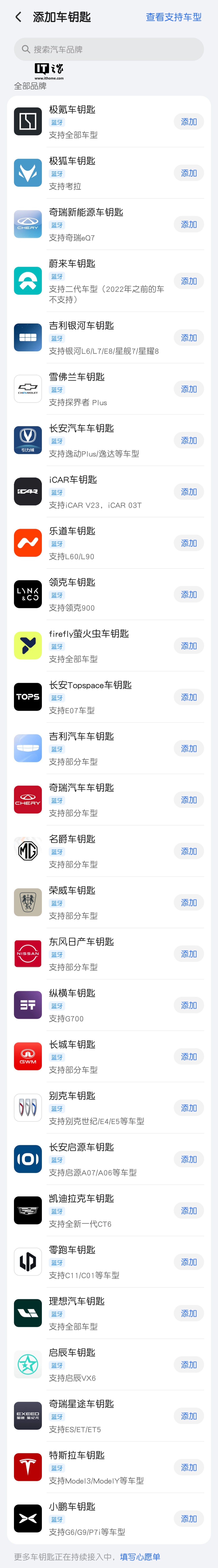 IT之家整理目前荣耀钱包支持添加的车钥匙如下:比亚迪王朝 / 海洋、特斯拉、理想、零跑、极氪、小鹏、长安启源、别克、深蓝、蔚来、腾势、极狐、奇瑞星途、吉利银河、方程豹、凯迪拉克、奇瑞新能源、仰望、启辰、雪佛兰、长安汽车、奇瑞 iCAR、乐道、领克、Firefly 萤火虫、宝马、吉利汽车、奇瑞、长安 Topspace、荣威、名爵、东风日产、捷途纵横、智己、长城汽车。