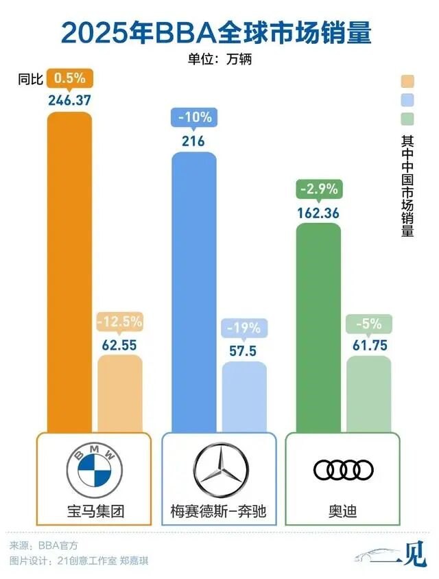 宝马2023年销量还在82.5万辆的高点,2025年就跌至62.55万辆,同比下滑12.5%,短短两年在中国损失了约20万辆的份额。